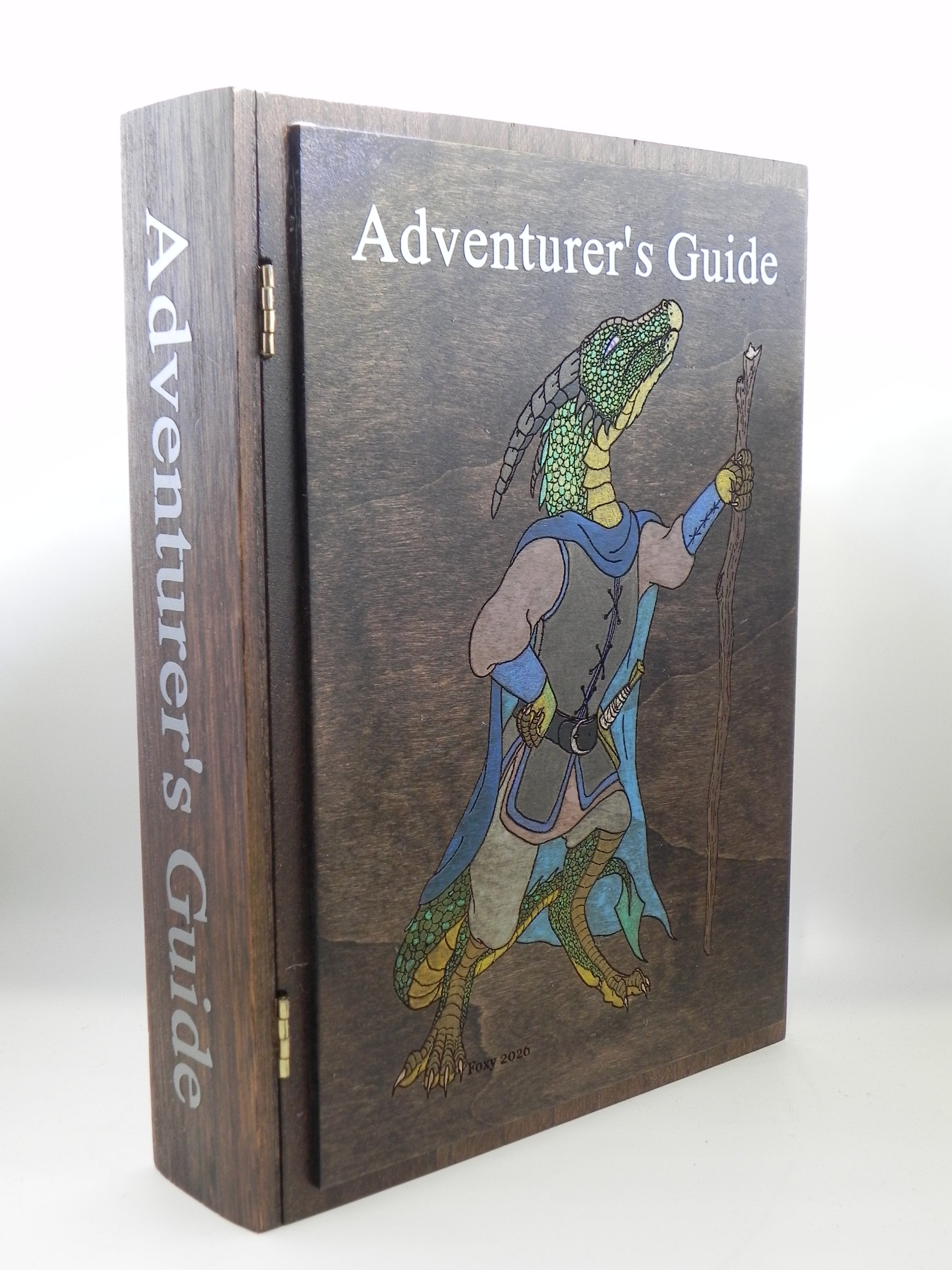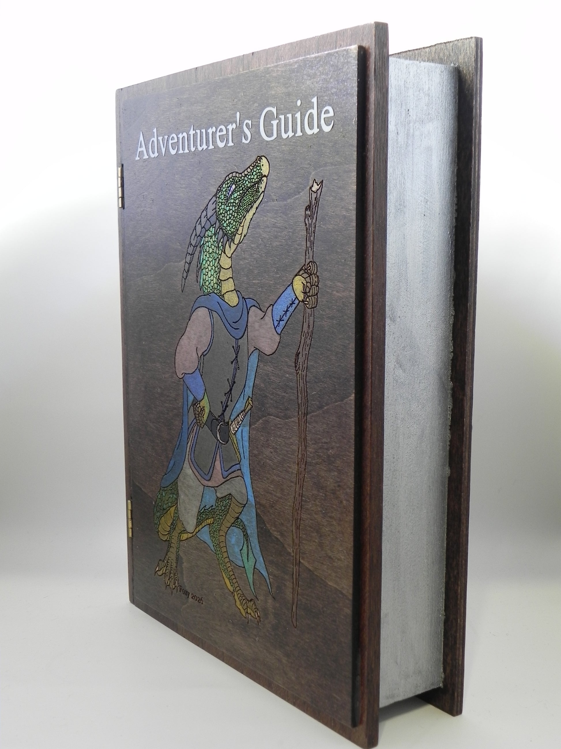 This book shaped box is primed and ready to contain a dog lover's many adventures. Red oak stained with an original artwork outline of a dragon adventurer laser engraved and hand painted. Sealed and felt lined to protect all your dice. Dice sold separately.