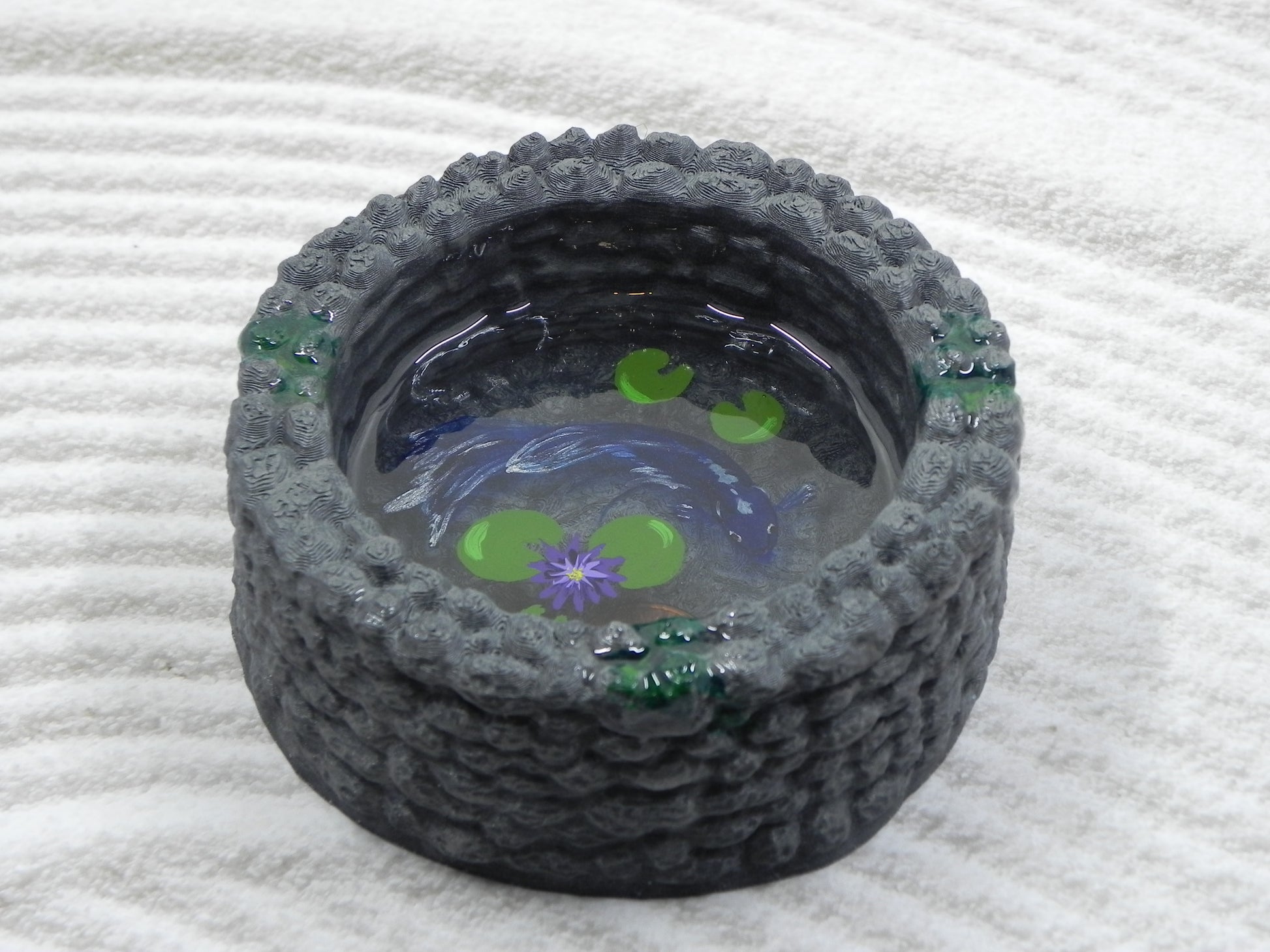 3D printed well for durability. Real penny set in the bottom with a layered blue beta fish with purple pond lily.