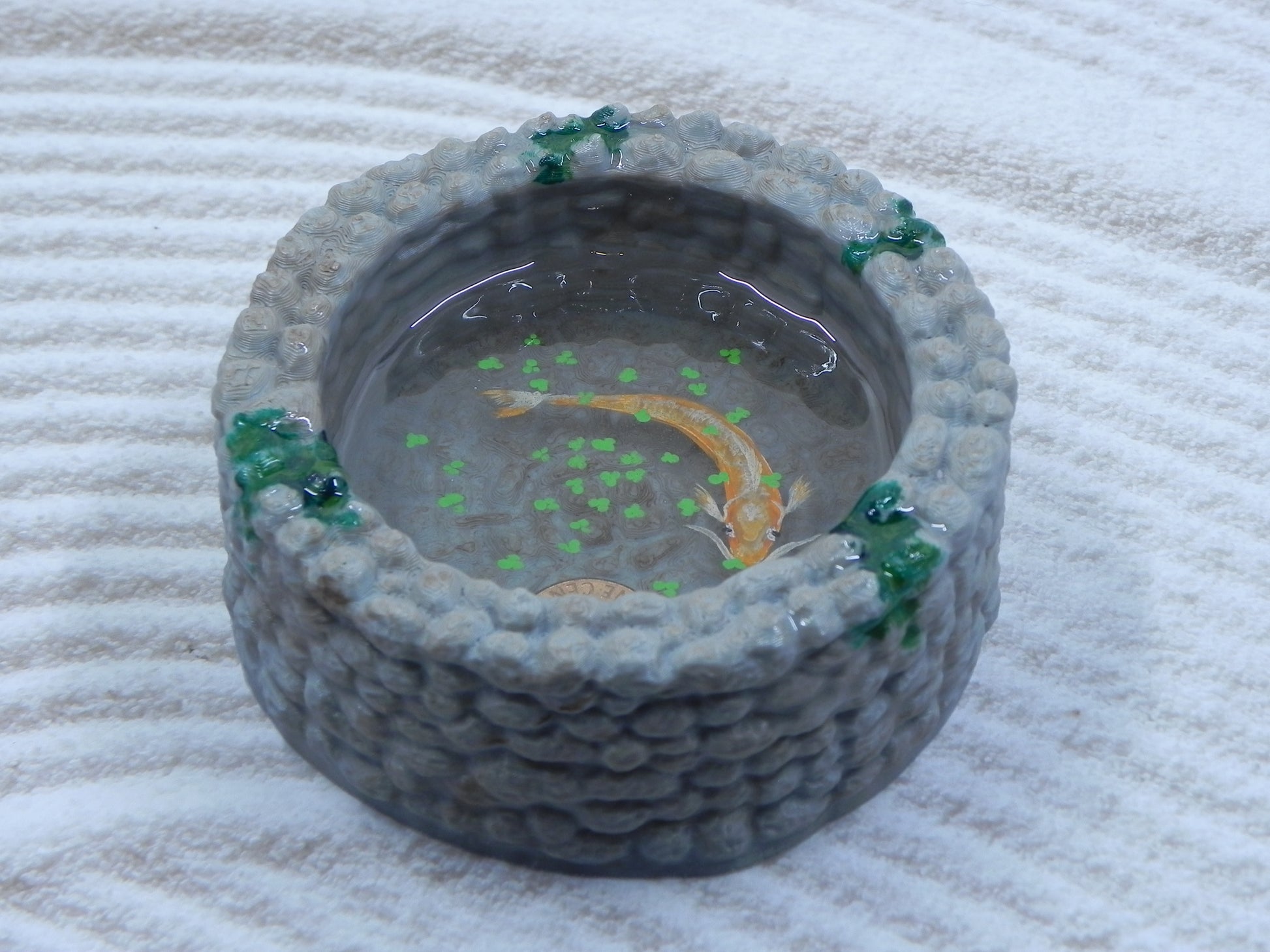 3D printed well for durability. Real penny set in the bottom with a layered koi with pond weed.