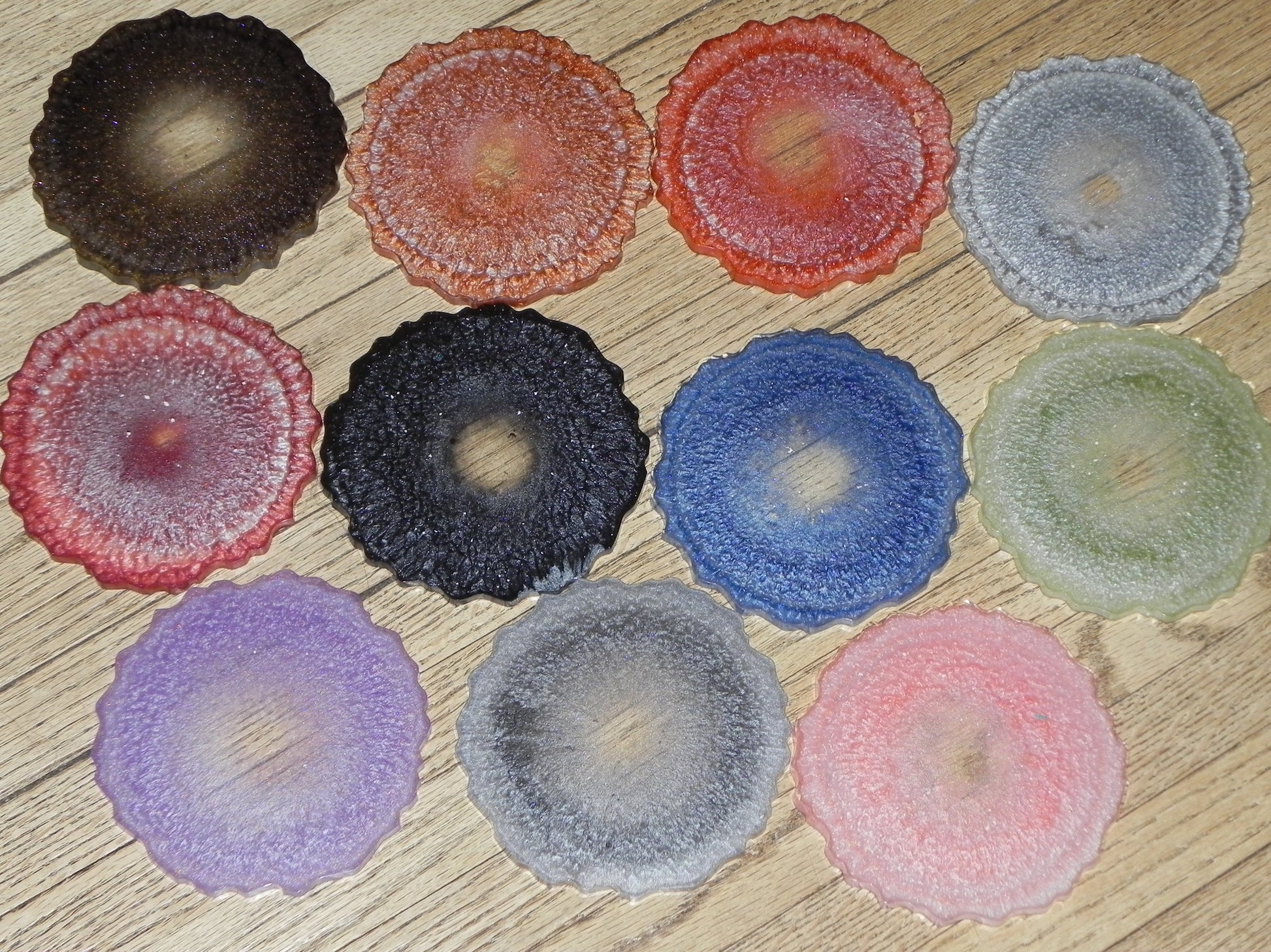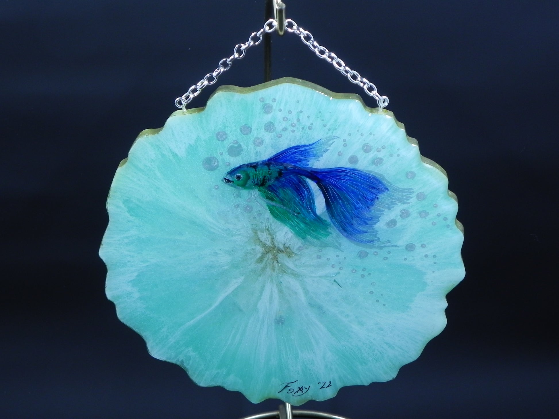 Resin makes for an unusual painting surface, geodes make wonderful shapes! Hand-poured geode with acrylic painting sealed with a clear resin topcoat faux stone edging. Comes with display easel, option of having a silver hang chain (no extra charge)--message Foxy
